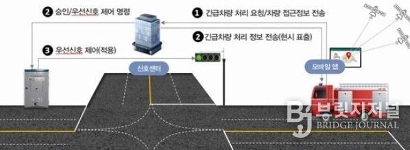 긴급차량 우선신호시스템은 골든타임 확보가 필요한 긴급차량이 차량 내 단말기에 목적지를 입력하면, 위치정보를 바탕으로 교차로 신호를 제어해 현장이나 병원까지 보다 신속하게 이동할 수 있도록 지원하는 시스템이다.