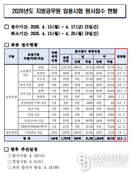 브릿지저널 윤나영 기자 | 부산광역시교육청은 지난 13일부터 17일까지 실시한 ‘2026년도 지방공무원 임용시험’ 원서접수 결과 144명 선발에 1,753명이 지원해 평균 12.2대 1의 경쟁률을 보였다고 밝혔다.