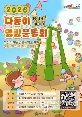 브릿지저널 윤나영 기자 | 해운대구는 다자녀가정 우대 및 가족친화적 분위기 조성을 위해 '2026년 다둥이 명랑 운동회'에 참여할 다자녀가족 100가정을 모집한다.