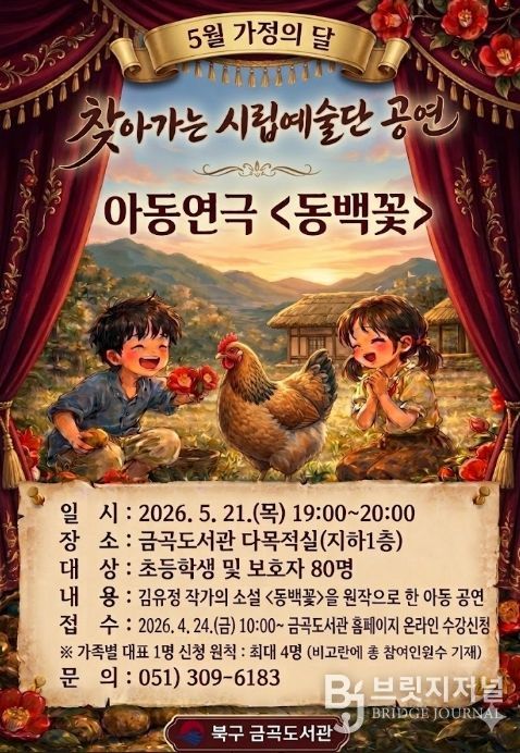 브릿지저널 윤나영 기자 | 부산 북구는 오는 5월 21일 저녁 7시, 5월 가정의 달을 맞아 금곡도서관에서 지역 주민을 대상으로 김유정 작가의 단편소설 ‘동백꽃’을 원작으로 한 아동연극 공연을 개최한다고 밝혔다.