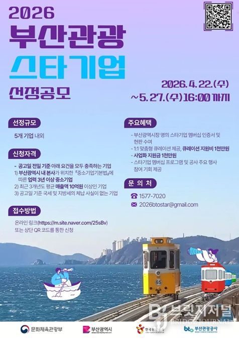 브릿지저널 윤나영 기자 | 부산시와 부산관광공사는 부산관광기업지원센터가 외국인 관광객 500만 시대를 선도할 지역 관광산업의 핵심 주역을 발굴하기 위해 '2026 부산관광 스타기업 공모'를 실시한다고 밝혔다.