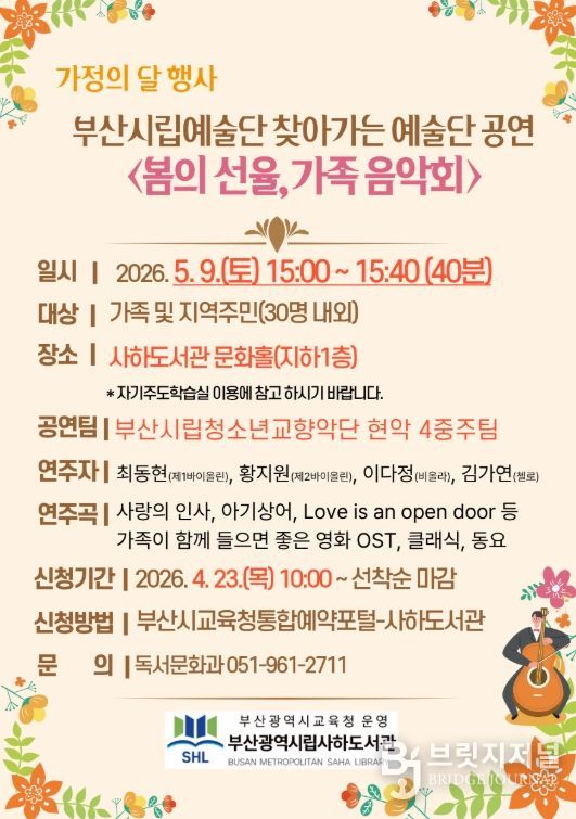 브릿지저널 윤나영 기자 | 부산광역시립사하도서관은 가정의 달을 맞아 다음달 9일 오후 3시 도서관 문화홀에서 지역주민 30명을 대상으로 부산시립예술단 찾아가는 예술단 공연 ‘봄의 선율, 가족 음악회’를 개최한다.