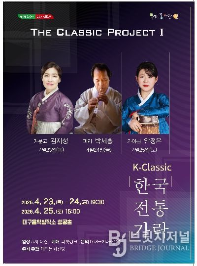 브릿지저널 김진석 기자 | 대구 남구 대덕문화전당이 순수예술 활성화를 위해 지난해 신설한 ‘The Classic Project’의 2026년 상반기 시리즈가 세계적으로 각광받고 있는 국악의 매력을 소개하는 무대들로 오는 4월 23일부터 4월 25일까지 사흘간 대구음악창작소 창공홀에서 펼쳐진다.