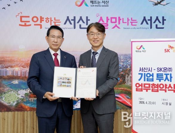 시는 22일 시청 시장실에서 이완섭 서산시장, 피승호 SK온㈜ 총괄 부사장이 참석한 가운데 협약식을 개최했다.