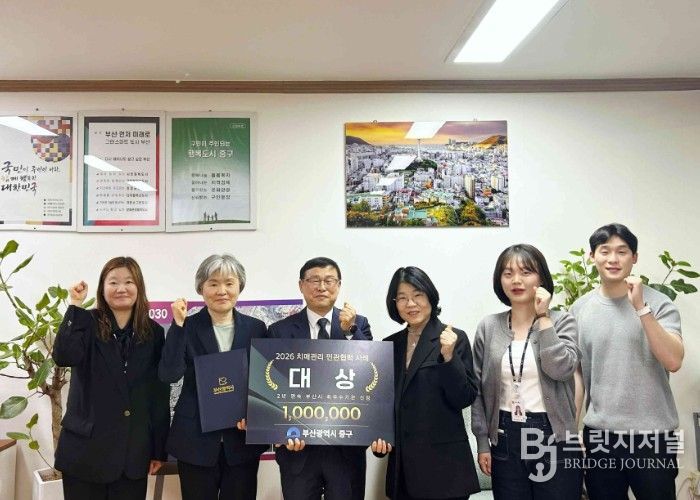 브릿지저널 윤나영 기자 | 부산 중구는 2026년 치매관리 민관협력 우수사례 공모전에서‘소지역 맞춤형 기억동행, 중구형 치매보듬마을’사례로 대상을 수상했다고 밝혔다.