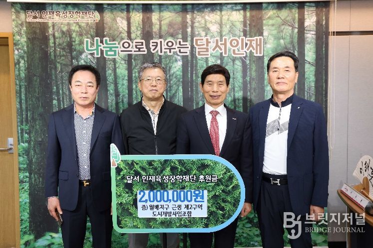 브릿지저널 김진석 기자 | 대구 달서구는 월배지구 근생 제2구역 도시개발사업조합(조합장 김희동)으로부터 지역 인재육성을 위한 장학금 200만 원을 (재)달서인재육성장학재단에 기탁받았다고 23일 밝혔다.