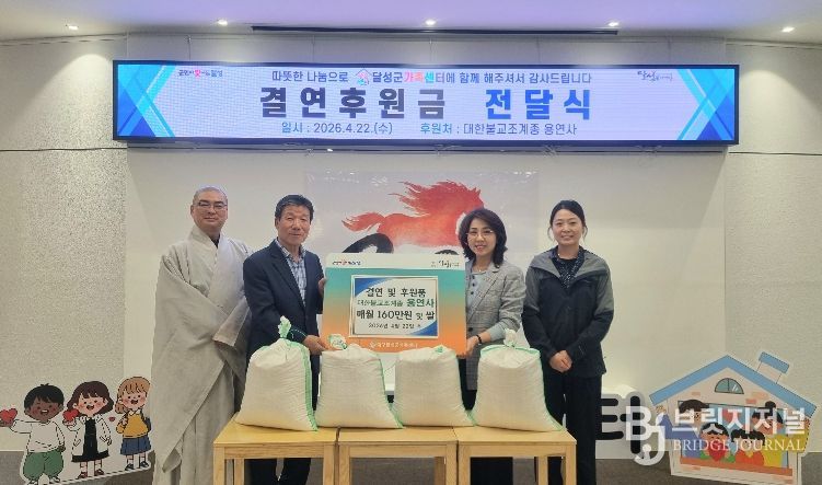 브릿지저널 김진석 기자 | 달성군가족센터(센터장 방승희)는 지난 22일 센터 내에서 대한불교조계종 용연사(주지 능도 스님)와 함께 ‘취약·위기 다문화가정 결연금 전달식’을 가졌다고 밝혔다. 이번 사업은 경제적 고통과 위기 상황에 놓인 관내 저소득 다문화 8가구를 돕기 위해 기획됐다.