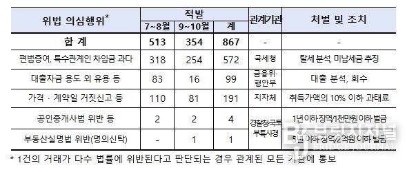 이번 기획조사는 대출규제 강화, 토지거래허가구역 확대 등 시장 안정화 대책이 본격적으로 실행됨에 따라, 편법 대출·증여나 토지거래허가 위반 등 시장질서를 교란하는 이상거래가 확대될 우려에 대비하여 서울 및 경기 일부지역(6곳)에 한정했던 ’25.1월~6월 조사와 달리 해당 지역 외에 경기 9곳을 추가 확대하여 ‘25.7월 ~ 10월 거래 신고분에 대해 실시했으며,이상거래 총 2,255건을 조사하여 위법 의심거래 746건(위법의심행위 867건)을 적발했다.