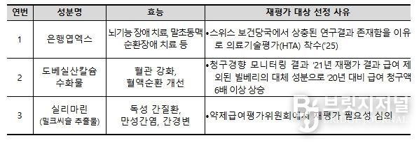 개편 평가체계에 따라 2026년도 평가 대상으로 은행엽엑스, 도베실산칼슘수화물, 실리마린(밀크씨슬 추출물) 총 3개 성분이 선정됐으며, 구체적 선정 사유는 아래와 같다.