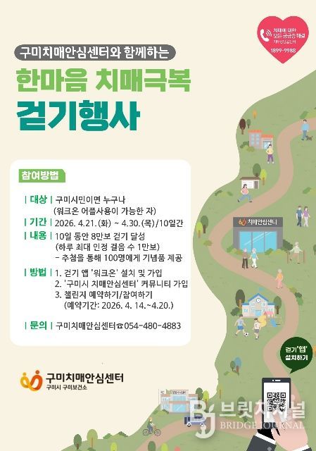 브릿지저널 정보영 기자 | 구미시는 치매 예방과 시민 건강 증진을 위해‘2026년 한마음 치매극복 걷기 챌린지’를 운영한다. 이번 챌린지는 시민 누구나 참여할 수 있는 비대면 걷기 프로그램으로 진행된다.