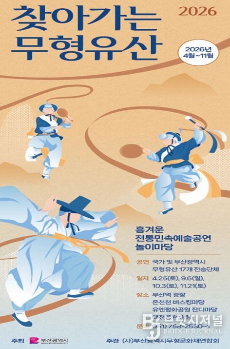 브릿지저널 윤나영 기자 | 부산시는 무형유산 전통 민속예술의 가치를 확산하고, 신명 나고 흥겨운 전통 민속예술 공연으로 시민들의 삶에 활력을 불어넣기 위해 '2026 찾아가는 무형유산' '전통민속예술공연 놀이마당'을 개최한다고 밝혔다.