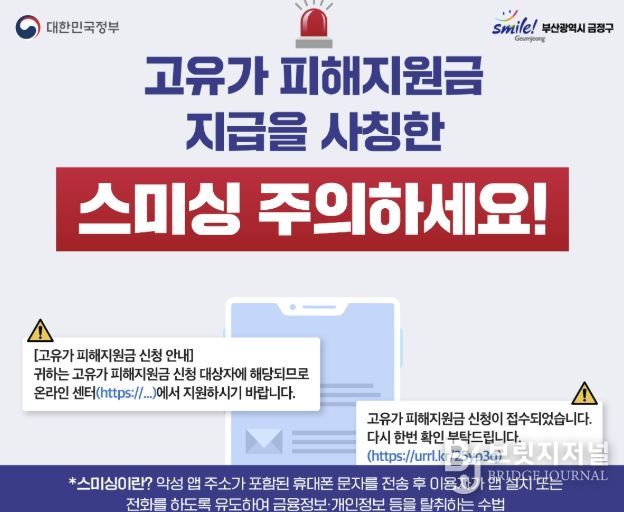 브릿지저널 윤나영 기자 | 부산 금정구는 오는 4월 27일부터 ‘고유가 피해지원금’ 지급이 시작됨에 따라 이를 사칭한 스미싱(문자 결제 사기) 피해 예방을 위해 구민들에게 각별한 주의를 당부한다고 23일 밝혔다.
