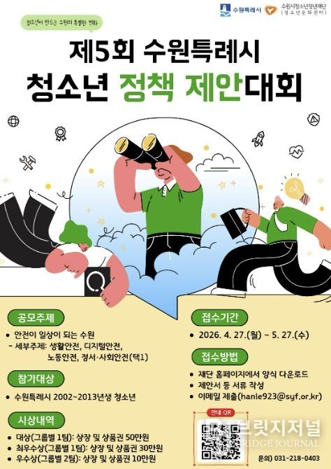 브릿지저널 김경미 기자 | 수원시청소년청년재단 수원청소년문화센터는 청소년이 정책을 기획하고 제안하는 ‘제5회 수원특례시 청소년 정책 제안대회’ 참가팀을 4월 27일부터 5월 27일까지 모집한다.