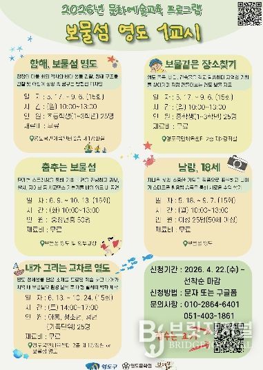 브릿지저널 윤나영 기자 | 부산시 영도구는 지역 자원을 활용한 영도형 문화예술교육 프로그램인 ‘보물섬영도 1교시’ 참여자를 오는 5월부터 본격 운영한다.