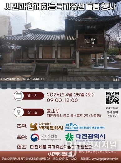 브릿지저널 정보영 기자 | 대전시는 대전문화유산 돌봄센터와 함께 4월 25일 오전 9시부터 12시까지 봉소루 일원에서‘시민과 함께하는 국가유산 돌봄행사’를 개최했다. 이번 행사는 2014년부터 지속적으로 추진해 온 행사로 국가유산 보존의 중요성을 널리 알리고 시민 참여를 확대하기 위해 마련됐다.