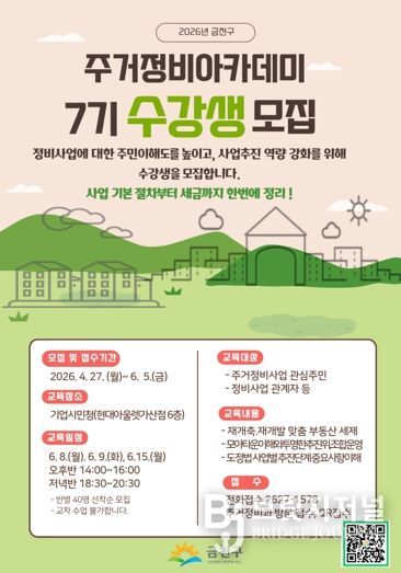 브릿지저널 김경미 기자 | 금천구는 주거지 정비사업에 대한 주민 이해도를 높이고 사업 추진 역량을 강화하기 위해 오는 27일부터 ‘금천구 주거정비아카데미 7기’ 수강생을 모집한다고 밝혔다.