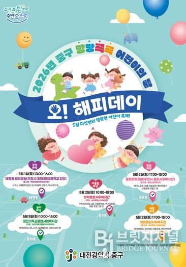 브릿지저널 정보영 기자 | 대전 중구가 다가오는 5월 1일부터 5일까지 '2026년 중구 방방곡곡 어린이의 달 오! 해피데이' 어린이달 축제를 개최한다고 밝혔다.