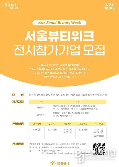 참여를 희망하는 기업은 5월 18일까지 구글 폼을 통해 신청할 수 있으며, 자세한 사항은 서울뷰티위크 공식 누리집 또는 서울시 누리집에서 확인할 수 있다.