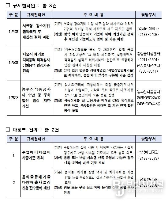 시는 자체적으로 개선 가능한 ▴서울형 강소기업 협약해지 후 재신청 절차 마련(174호) ▴서울시 폐기물 처리용역 적격심사 당해용역 인정기준 완화(175호) ▴농수산식품공사 내 수납 및 주차할인 방식 제한 개선(176호) 과제는 정비하고, ▴수열에너지 설비 시공기준 완화, ▴음식물류폐기물 다량배출사업장 신청․접수방식 개선 등 2건은 정부에 공식 건의했다.