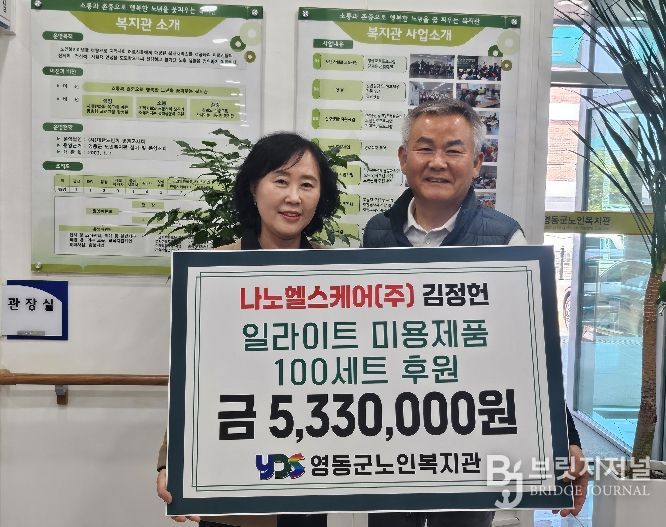 브릿지저널 김경미 기자 | 경북 구미시 소재 나노헬스케어(주) 김정헌 대표는 27일 영동군노인복지관을 찾아 일라이트 비누 등 미용제품 533만 원 상당을 기탁했다.