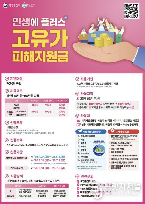 브릿지저널 김경미 기자 | 마포구는 중동 전쟁 여파로 이어진 고유가·고물가 상황 속에서 구민의 경제적 부담을 덜고 지역경제에 활력을 불어넣기 위해 ‘고유가 피해지원금’을 지급한다.