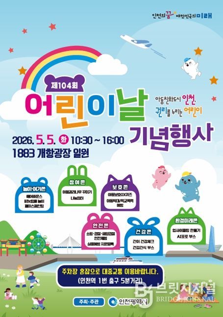 브릿지저널 김경미 기자 | 인천광역시는 제104회 어린이날을 맞아 어린이의 권리 존중과 참여 확대를 위한 기념행사를 오는 5월 5일 오전 10시 30분부터 오후 4시까지 중구 북성동 ‘1883 개항광장 일원’에서 개최한다고 밝혔다.
