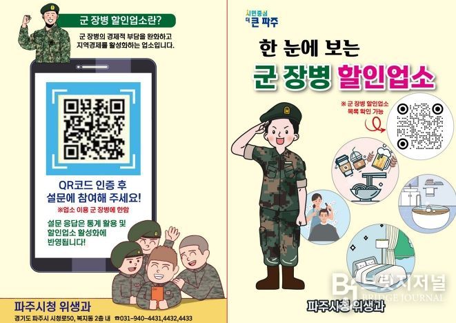 브릿지저널 김경미 기자 | 파주시는 군 장병의 경제적 부담 완화와 지역 경제 활성화를 위해 추진 중인 ‘군 장병 할인업소’사업을 더욱 쉽게 알리기 위해 ‘한눈에 보는 군 장병 할인업소’홍보물을 제작해 배부한다.