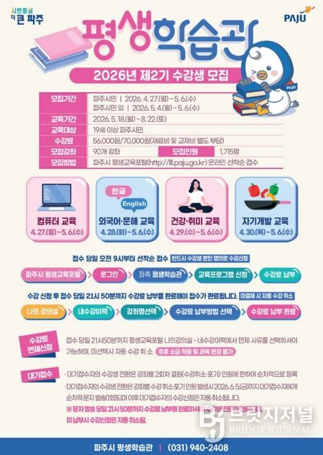 브릿지저널 김경미 기자 | 파주시 평생학습관은 시민의 평생학습 기회를 확대하기 위해 '2026년 제2기 정규강좌’수강생을 오는 4월 27일부터 5월 6일까지 모집한다.