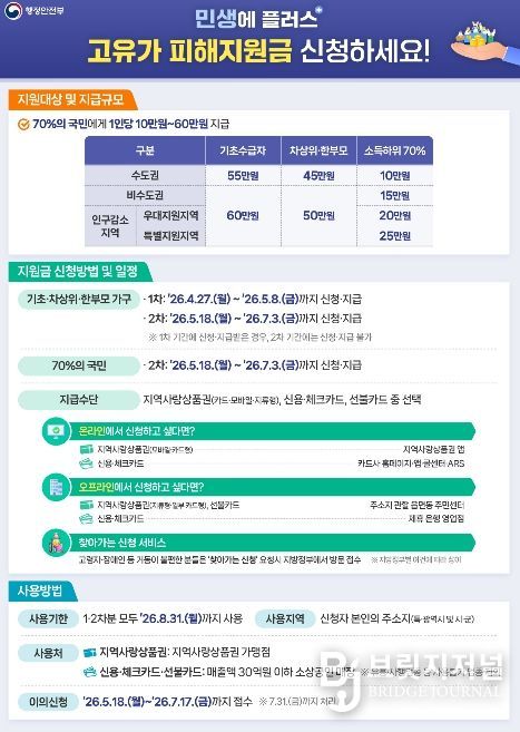 4월 27일부터 5월 8일까지 진행되는 1차 지급 대상은 기초생활수급자, 차상위계층, 저소득 한부모가족이다. 지원 금액은 ▲기초생활수급자 55만 원 ▲차상위계층·저소득 한부모가족 45만 원이다.