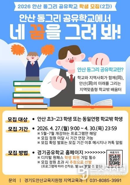 브릿지저널 김경미 기자 | 안산시 중앙도서관은 내달부터 안산교육지원청이 추진하는 ‘2026년 안산 동그리 우리동네 도서관 공유학교’ 사업에 참여해 지역 교육 인프라 확충에 나선다고 27일 밝혔다.
