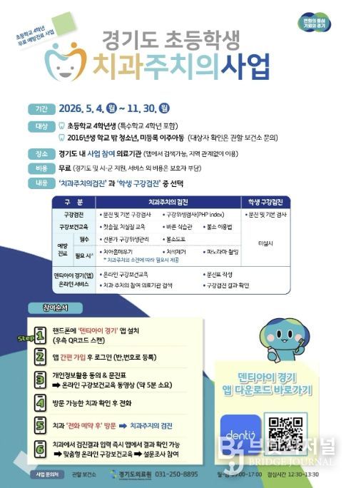 브릿지저널 김경미 기자 | 안산시는 경기도와 협력해 관내 초등학교 4학년 학생을 대상으로 ‘초등학생 치과주치의 사업’을 추진한다고 27일 밝혔다.