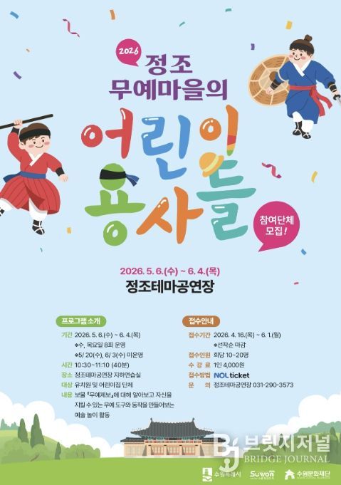 브릿지저널 김경미 기자 | 수원문화재단 정조테마공연장의 대표 예술교육 프로그램 '정조무예마을의 어린이 용사들'의 상반기 교육이 접수 마감되며 큰 호응을 얻고 있다.