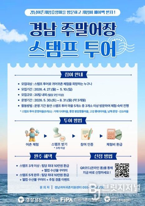 또한, 마을별 3회 이상 스탬프 투어를 완료한 팀에게는 팀당 최대 10만 원의 체험비를 지원하고, 경남 어촌 특화 상품도 별도 제공할 예정이다.