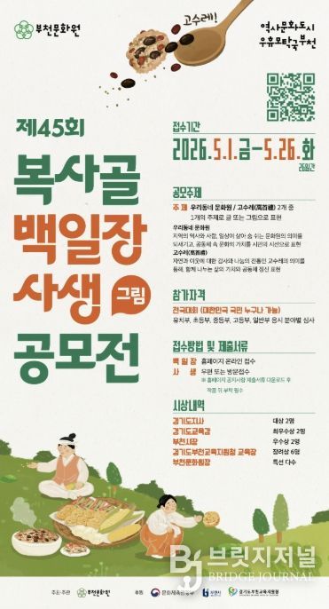 브릿지저널 김경미 기자 | 부천문화원이 설립 60주년을 기념하여 지역 문화의 가치를 시민과 공유하고 향토문화의 지속가능한 기반을 마련하기 위한 ‘제45회 복사골 백일장·사생(그림) 공모전’을 개최한다. 이번 공모전은 지난 60년간 지역 문화의 구심점 역할을 해온 부천문화원의 역사를 되짚어보고, 국민의 참여를 통해 지역 공동체의 유대감을 강화하고자 기획됐다.