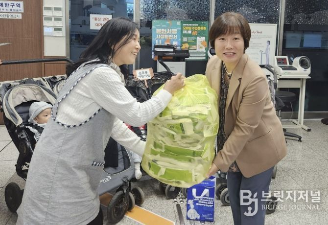 이날 은초롱 어린이집 원아와 관계자들은 정자3동 행정복지센터를 방문해 우유팩과 폐건전지 등 유용생활폐자원을 분리 배출하며 자원순환의 의미를 되새겼다.