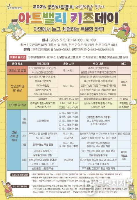 브릿지저널 김경미 기자 | 포천문화관광재단이 운영하는 포천아트밸리는 오는 5월 5일 어린이날을 맞아 어린이와 가족을 위한 체험형 문화행사 ‘아트밸리 키즈데이’를 개최한다.