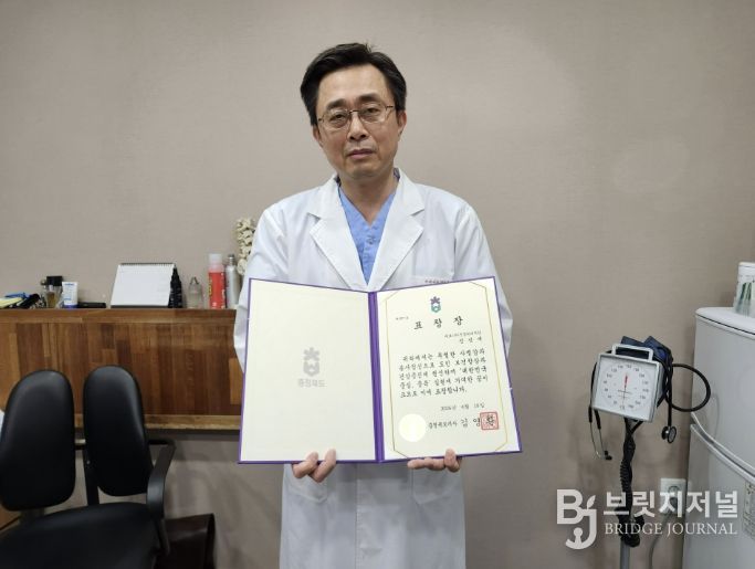 브릿지저널 김경미 기자 | 충주시 소재 베로니카신경외과의원 신성재 원장이 ‘제54회 보건의 날’ 기념행사에서 도민 보건 향상에 기여한 공로를 인정받아 충청북도지사 유공자 표창을 수상했다.