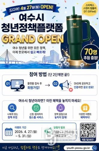 브릿지저널 김경미 기자 | 여수시는 청년들에게 맞춤형 정책 정보를 제공하고 양방향 소통을 지원하기 위한 ‘여수시 청년정책 플랫폼’을 27일 정식 운영 개시하고, 이를 기념한 특별 이벤트를 진행한다고 밝혔다.