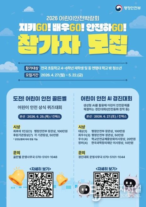 브릿지저널 김경미 기자 | 행정안전부는 6월 25일부터 27일까지 경기도 고양시 킨텍스(KINTEX)에서 ‘2026 어린이안전박람회’를 개최한다. 올해 박람회는 ‘지키GO! 배우GO! 안전하GO!’를 표어로, 어린이가 올바른 안전의식과 습관을 익힐 수 있도록 다양한 체험 활동으로 구성했다.