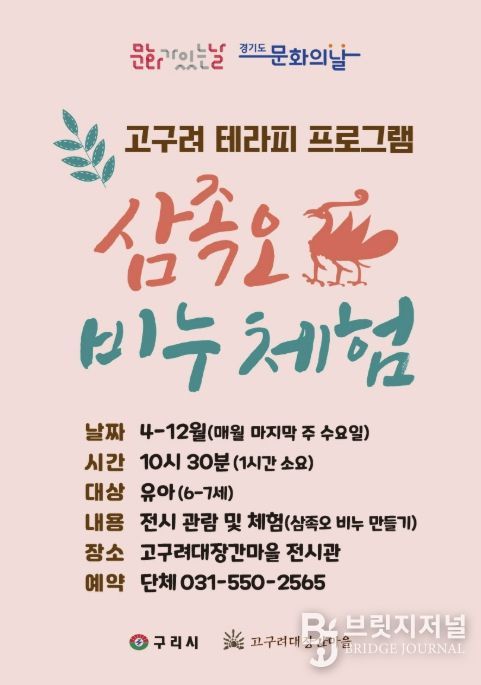 브릿지저널 김경미 기자 | 구리시는 4월부터 고구려대장간마을에서 매월 마지막 주 수요일 ‘문화가 있는 날’을 맞아 ‘삼족오 비누 체험! 고구려 치료 프로그램’을 운영한다고 밝혔다.