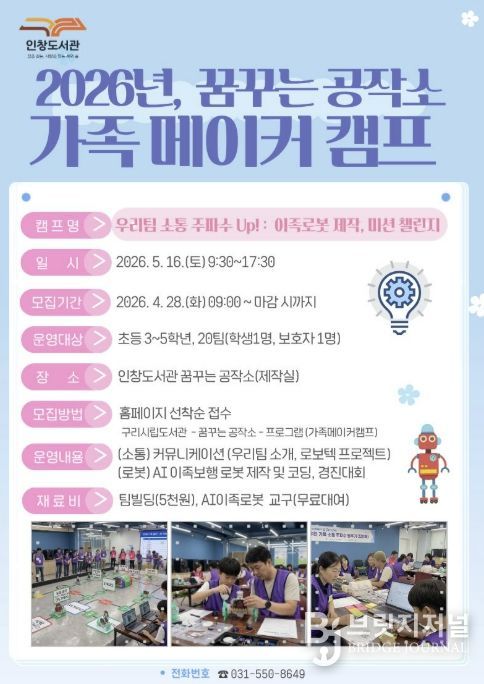 브릿지저널 김경미 기자 | 구리시 인창도서관‘꿈꾸는 공작소’는 오는 5월 16일 초등학생 자녀와 보호자가 함께 참여해 가족 간 유대감을 높이고 인공지능을 체험하는 '우리 팀 소통 주파수 Up! : 이족로봇 제작, 미션 챌린지' 가족 메이커 캠프를 운영한다고 밝혔다.