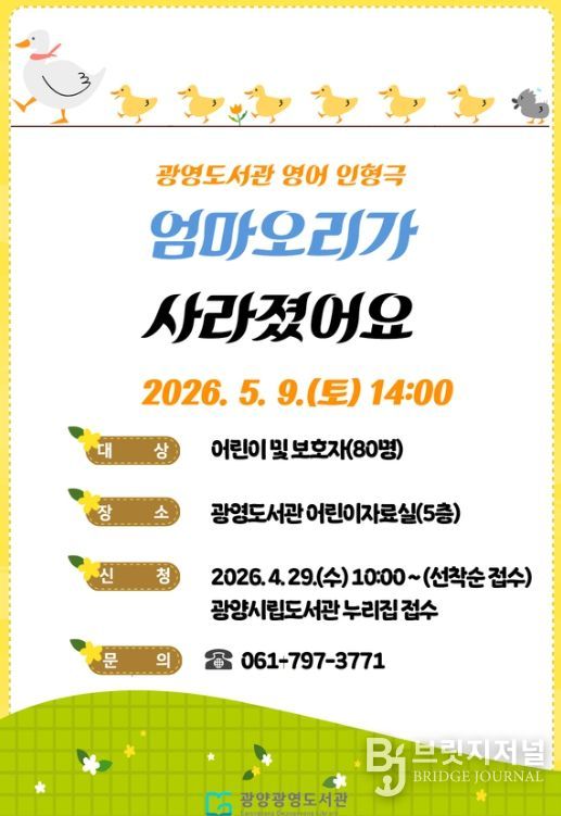 브릿지저널 김경미 기자 | 광양광영도서관은 가정의 달 5월을 맞아 오는 5월 9일 오후 2시 광영도서관 5층 어린이자료실에서 어린이 영어 인형극 '엄마 오리가 사라졌어요'를 연다.