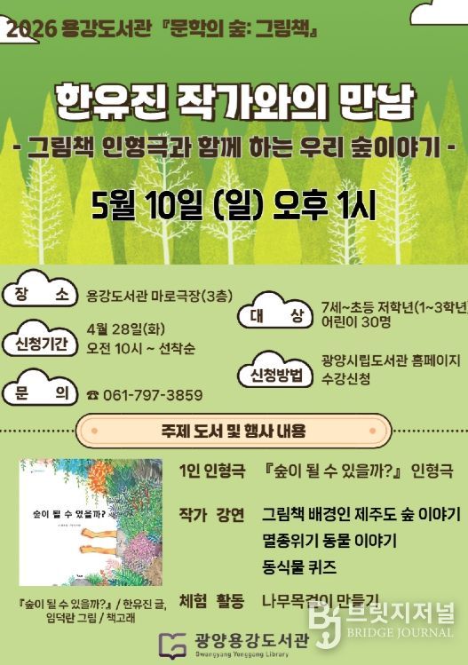 브릿지저널 김경미 기자 | 광양용강도서관은 어린이날을 맞아 5월 10일 오후 1시 3층 마로극장에서 어린이를 대상으로 ‘한유진 그림책 작가와의 만남’을 운영한다.
