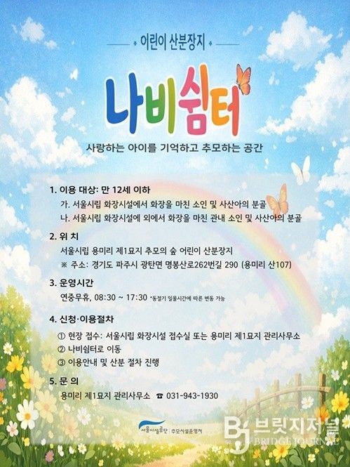 서울시는 5월 4일부터 용미리 제1묘지(경기도 파주시 소재) 추모의 숲 안에 약 500㎡ 규모 어린이 전용 산분장지 ‘나비쉼터’ 시범 운영에 들어간다고 밝혔다.