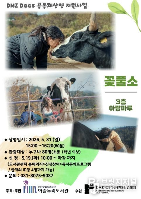 브릿지저널 김경미 기자 | 고양특례시 아람누리도서관은 DMZ국제다큐멘터리영화제와 협업해 오는 5월 31일 오후 3시, 도서관 3층 아람마루에서 다큐멘터리 영화 ‘꽃풀소’ 상영회를 개최한다.
