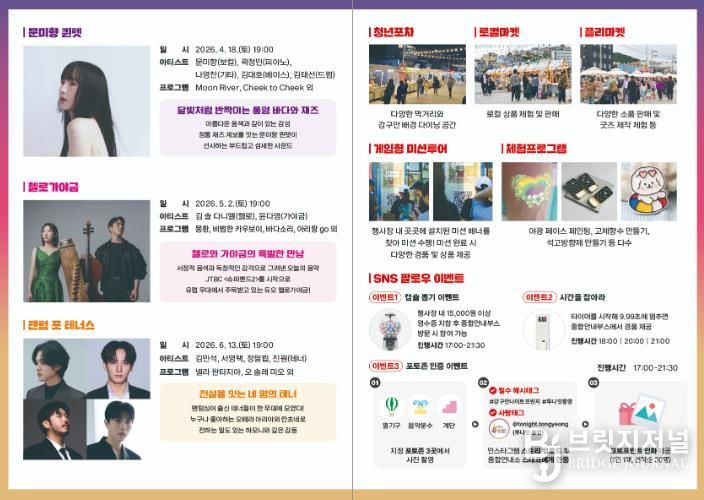 브릿지저널 김경미 기자 | 통영시는 오는 5월 2일 강구안 해상무대 및 일원에서 '2026 강구안 나이트 프린지, ‘투나잇 통영 즐거울 樂’'두 번째 공연을 개최한다.