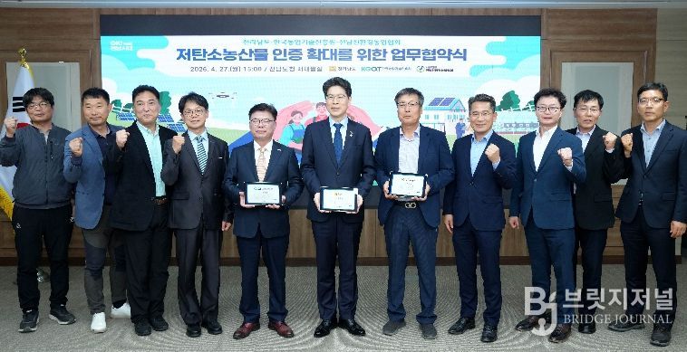 브릿지저널 김경미 기자 | 전라남도는 27일 도청에서 한국농업기술진흥원, 전남친환경농업협회와 함께 저탄소 농산물 인증 확대와 탄소 저감 실천을 위한 업무협약을 했다.