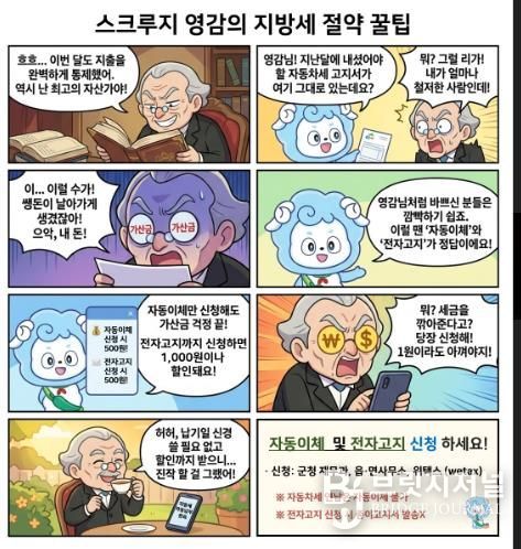 브릿지저널 정보영 기자 | 청양군이 스마트폰 환경에 익숙한 군민들을 위해 친숙한 캐릭터를 활용한 웹툰 ‘스크루지 영감의 지방세 절세 꿀팁’을 제작하고, 자동이체 및 전자고지 신청 독려에 나섰다.