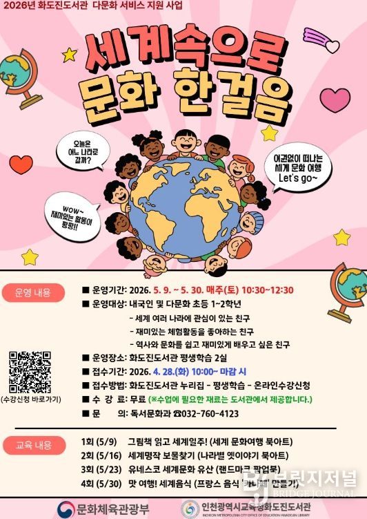 브릿지저널 김경미 기자 | 인천광역시교육청화도진도서관은 도서관 다문화 서비스 지원사업의 일환으로, 5월 9일부터 30일까지 매주 토요일 초등학생 대상 ‘세계속으로 문화 한걸음’프로그램을 운영한다.