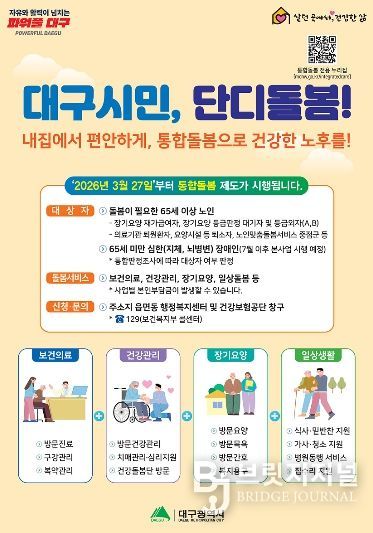 브릿지저널 김진석 기자 | 대구광역시는 지난 3월 27일 '돌봄통합지원법' 시행에 따라 추진 중인 대구형 통합돌봄 ‘단디돌봄’이 시행 한 달을 맞아 신청 접수부터 서비스 연계까지 현장에 안정적으로 정착하고 있다고 밝혔다.